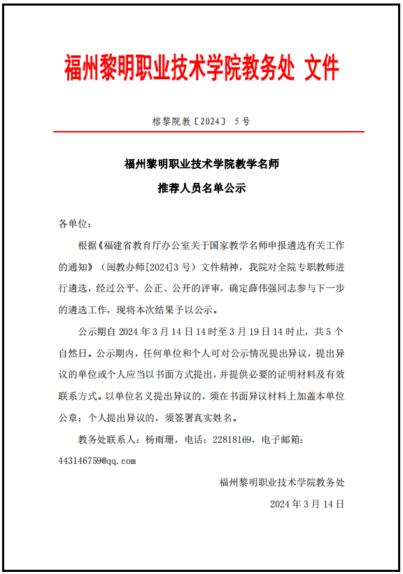 福州黎明职业技术学院教学名师推荐人员名单公示