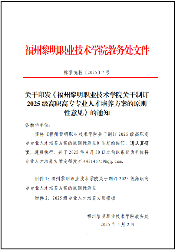 关于印发《福州黎明职业技术学院关于制订2025级高职高专专业人才培养方案的原则性意见》的通知