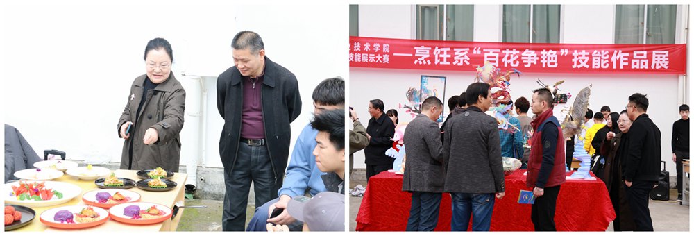 烹饪系“百花争艳”烹饪作品展:食品雕刻,如同昙花一般,短暂而奢华的美,将学生的心灵手巧体现得淋漓尽致,不同的食材通过不同方式的雕琢后将自然界中的美展现得惟妙惟肖;糖艺造型,如水晶般晶莹剔透,精美绝伦,创意无限;中式菜肴,独具匠心,学生们凭借无穷的想象力和创造力,在有限的食材下,打造出一幅幅生动形象的立体“画卷”。每一份作品不仅凝聚着学生们美丽的梦,还凝聚着他们勤学苦练、赶超一流的学习热情。一幅《喜鹊报喜》不正是预示着他们的未来将前程似锦,从黎明出发,喜报连连。通过本次比赛,实现了学生之间的技术切磋交流,也充分展现了同学们的想象力与创造力,同时,也为后期关于本专业的学习明确了方向,达到了以赛促学的目的。