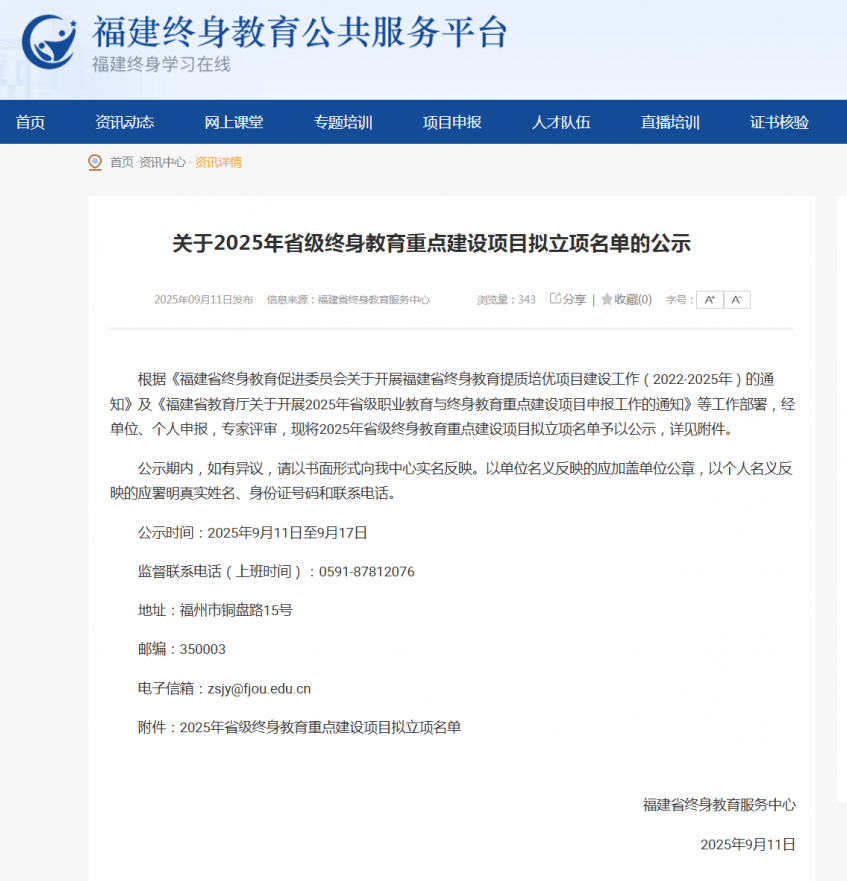 近日,福建省终身教育公共服务平台公示了2025年省级继续教育数字化精品课程拟认定名单,根据《福建省终身教育促进委员会关于开展福建省终身教育提质培优项目建设工作(2022-2025年)的通知》及《福建省教育厅关于开展2025年省级职业教育与终身教育重点建设项目申报工作的通知》,经单位、个人申报,专家评审,我校薛伟强老师负责的《美刻美点》、欧志亮老师负责的《网店运营推广》两门课程2门课程入选2025年省级继续教育数字化精品课程。