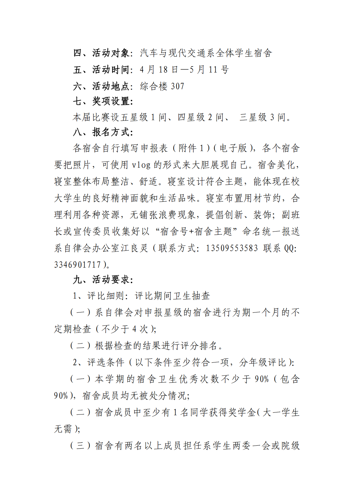 关于举办汽车与现代交通系 第八届宿舍美化大赛通知