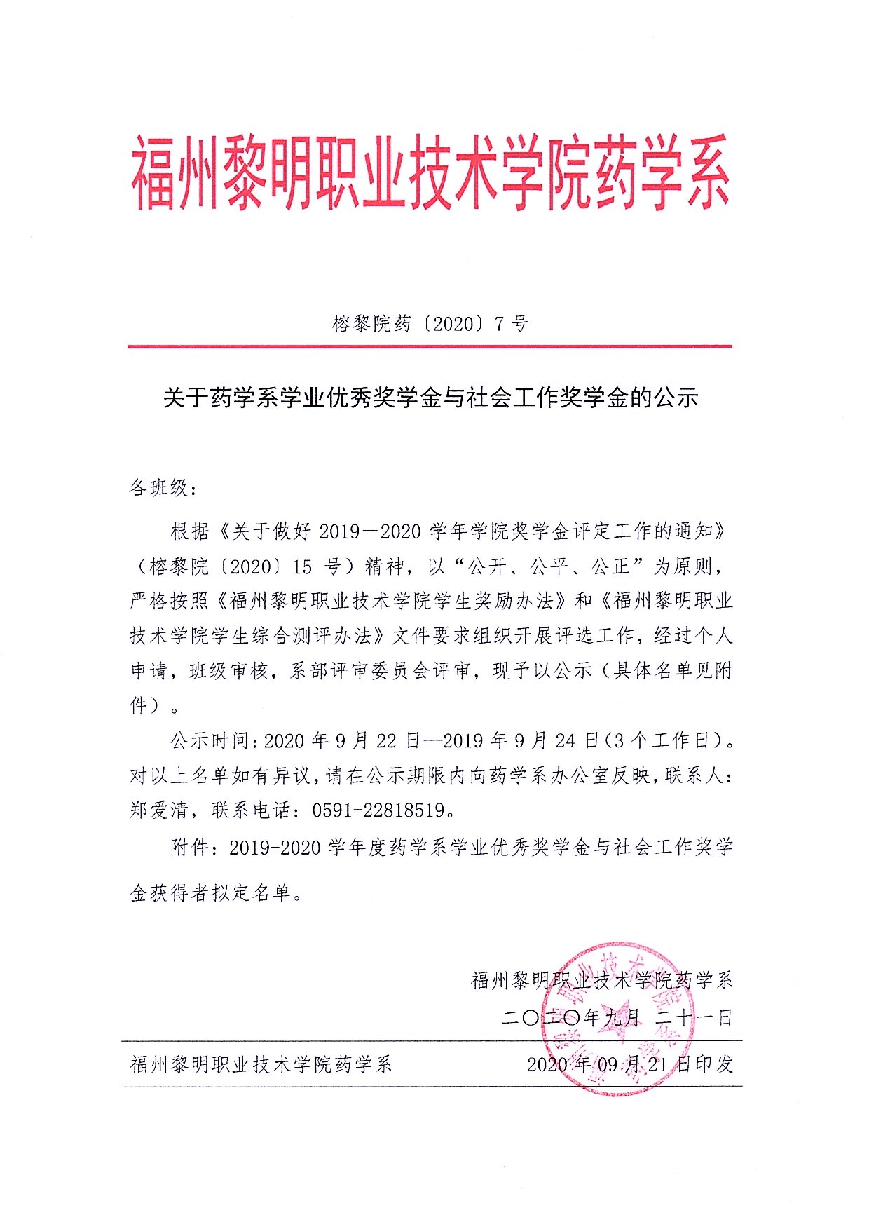 关于药学系学业优秀奖学金与社会工作奖学金的公示