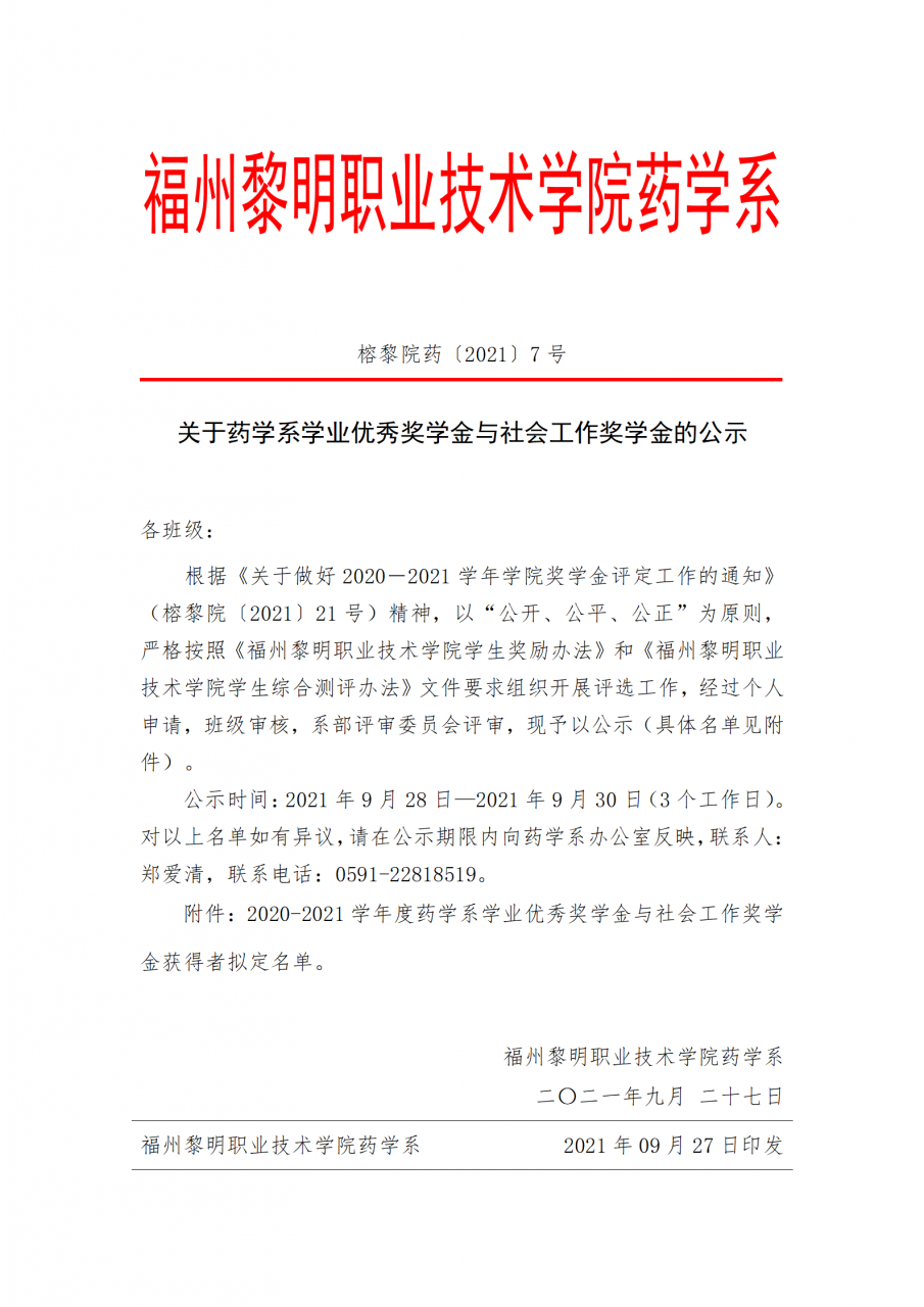 关于药学系学业优秀奖学金与社会工作奖学金的公示