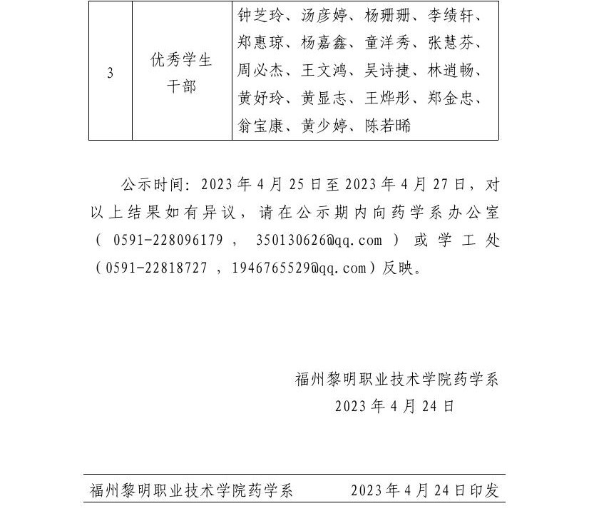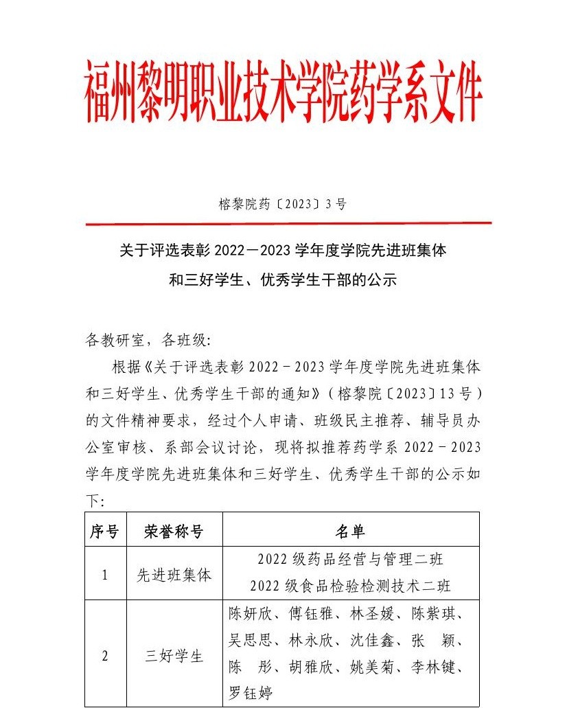 榕黎院药〔2023〕3号关于评选表彰2022-2023学年度学院先进班集体、三好学生和优秀学生干部的公示
