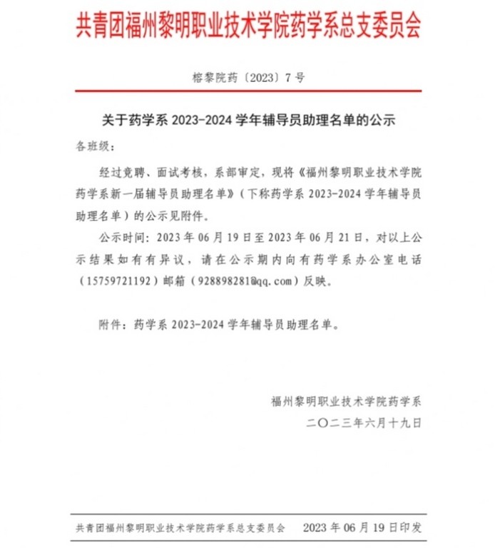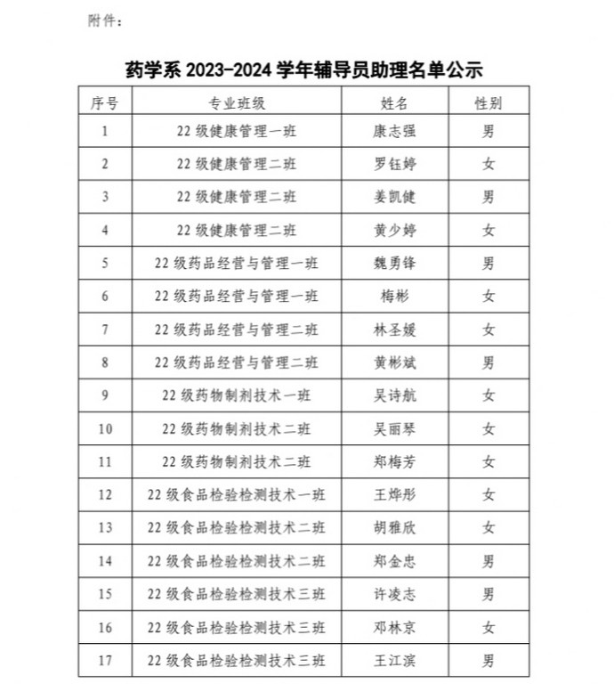 关于药学系2023-2024学年辅导员助理名单的公示