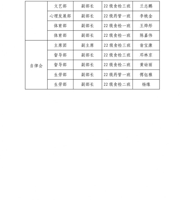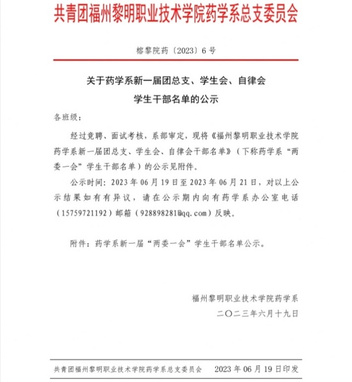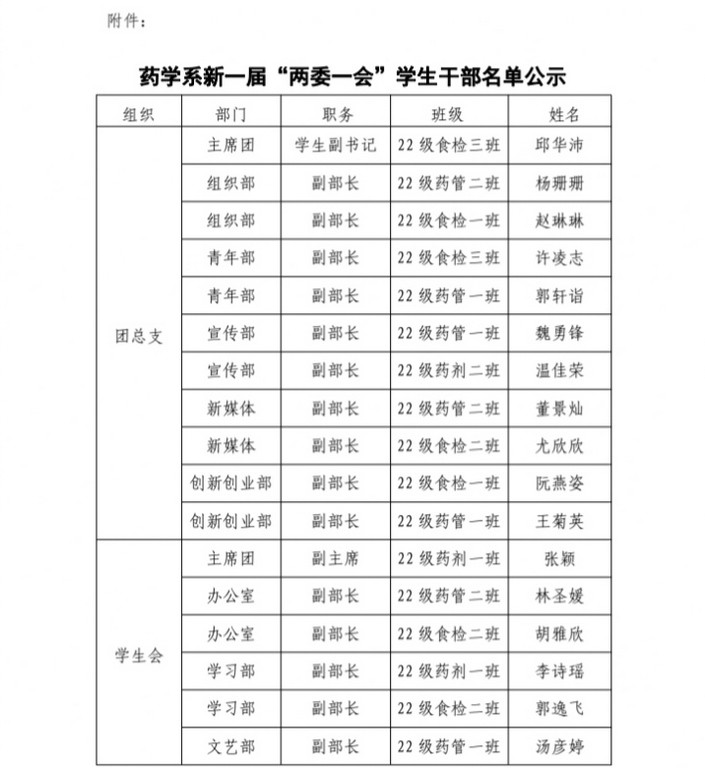 关于药学系新一届团总支、学生会、自律会 学生干部名单的公示