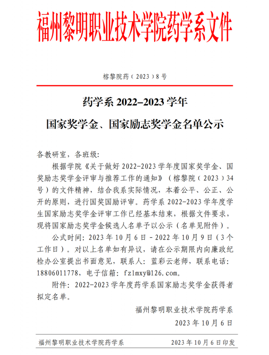 药学系2022-2023学年 国家奖学金、国家励志奖学金名单公示