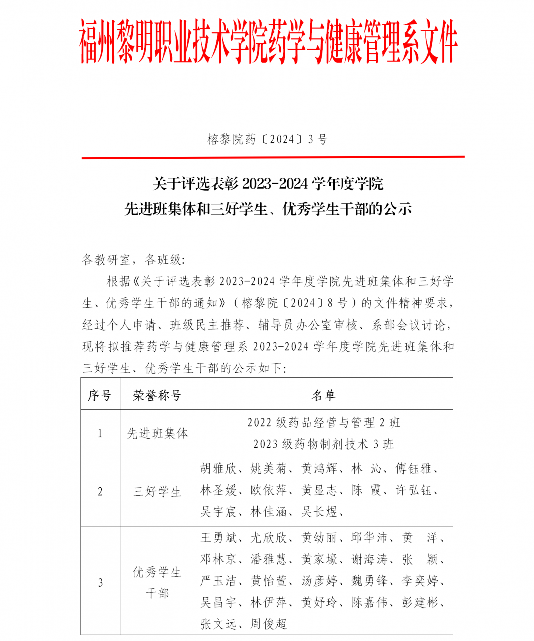 榕黎院药〔2024〕3号关于评选表彰2023-2024学年度学院先进班集体和三好学生、优秀学生干部的公示