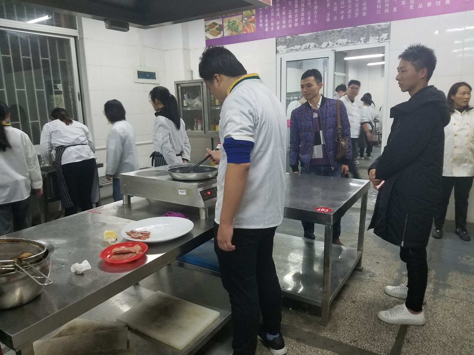 教务处一行视察了今天下午上课老师的教学情况,裘院长专门听了张晓兰老师的烹饪英语课程,邱娇玲老师观摩了杨金秋老师的果酱画课程,林雄光老师、罗晋煌老师和黄健老师走访烹饪实训室,实地了解我系实训室的一些硬件问题,最后,教务处一行与我系教研室主任吴丽珍和系教学秘书吴小青进行了深入的访谈。教务处各部门负责人对自己所负责的一块内容进行调研,吴丽珍老师就我系教学情况、安全稳定、意识形态、就业工作、期末工作进展、存在的问题一一做了解答。裘院长充分肯定了我系的各项工作,强调教务处以后要加强和系部的互动,提供更好的服务。