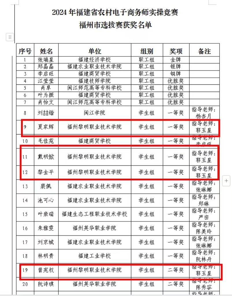 11 月 23 日,由省商务厅、省人社厅、省教育厅、团省委共同主办的首届福建省农村电子商务师职业技能选拔赛在福州圆满落幕。来自福州黎明职业技术学院经济管理系电子商务专业的学生们在此次大赛中表现出色,勇夺佳绩。