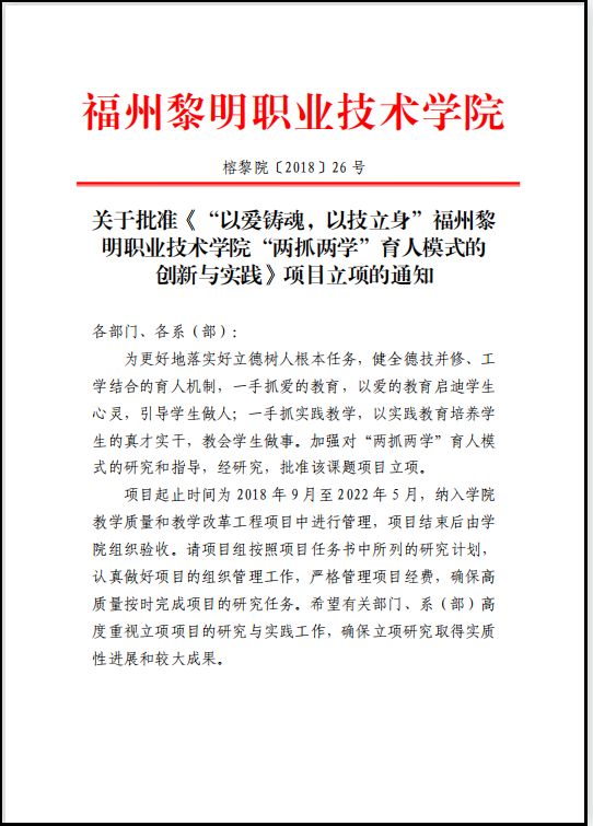 关于批准《“以爱铸魂,以技立身”福州黎明职业技术学院“两抓两学”育人模式的 创新与实践》项目立项的通知