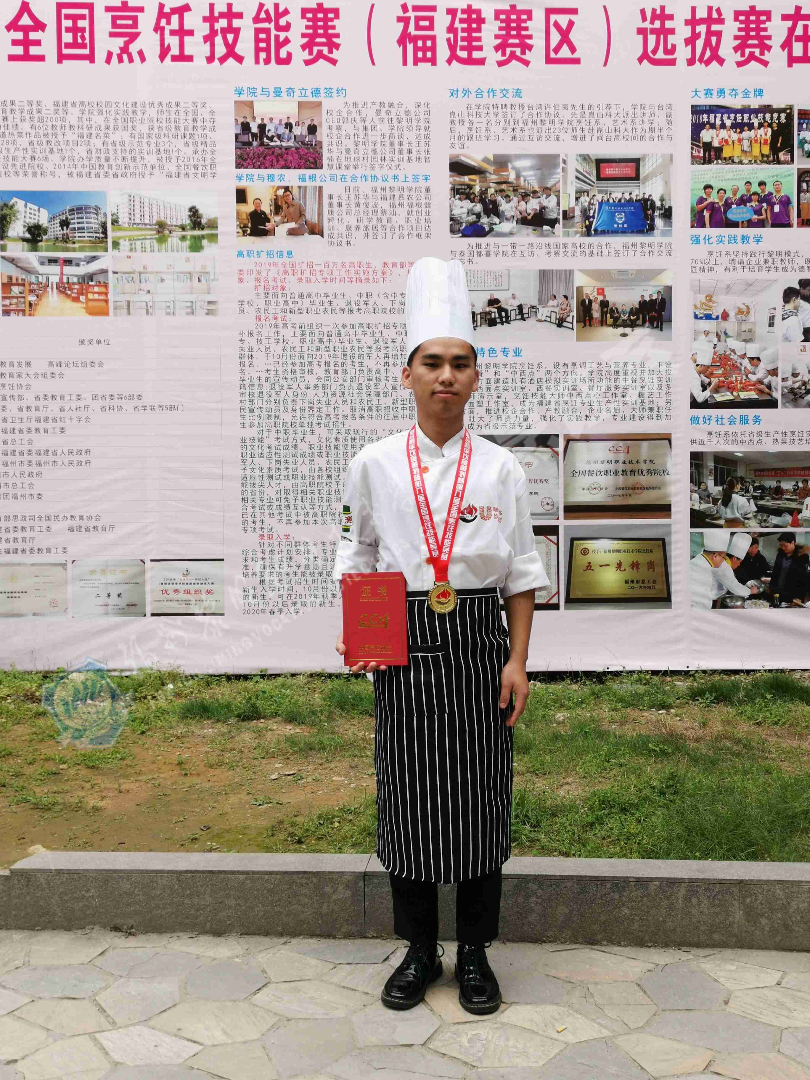 沈炎全,福建诏安人,烹饪系17级中西点二班学生,班级劳动委员,曾荣获学业三等奖学金,国家励志奖学金,荣获“联合利华饮食策划杯”第八届全国烹饪技能竞赛(分赛区)青年组中餐热菜金奖。
