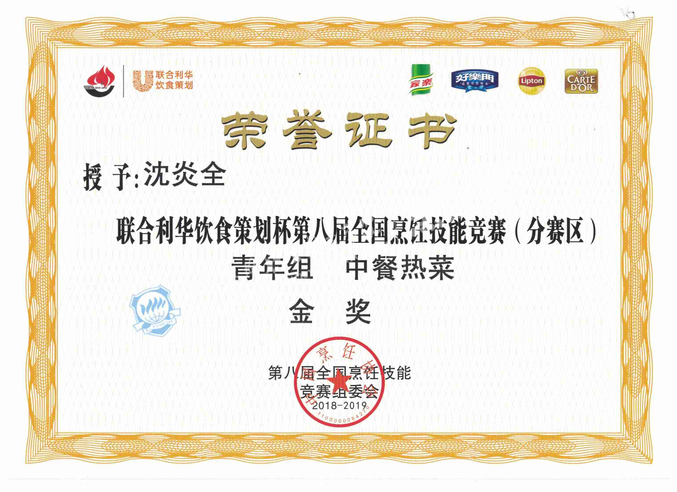 第八届全国烹饪技能竞赛青年组中餐热菜金奖—沈炎全
