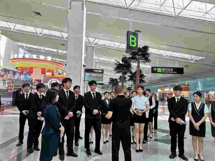 5月29日上午,福州黎明职业技术学院高速铁路客运服务专业的同学们在教研室主任余红老师和包文玄老师的带领下,前往长乐机场进行参观学习沉浸式体验。此次活动旨在让学生们近距离接触民航运作流程,加深对乘务服务的理解,并为未来的职业规划提供参考。