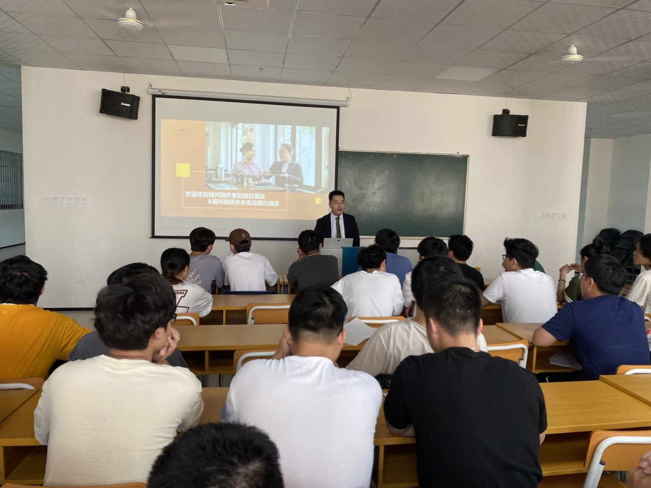 本次招聘会首先由集团人力资源部招聘培训经理向在场同学放映视频宣传片,展示了企业目前所拥有的资质,所获奖项等。随后,企业以 ppt 的形式就的一些规章,福利待遇,企业文化,现有产业结构,构架,人力资源等几个方面向同学们做了简单介绍,并现场解答了同学们的疑问。真诚的邀请黎明的同学们加人福州融侨皇冠假日酒店实现自己的梦想!