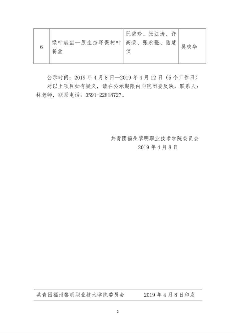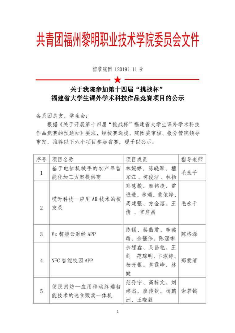 榕黎院团〔2019〕11号——关于我院参加第十四届“挑战杯”福建省大学生课外学术科技作品竞赛项目的公示