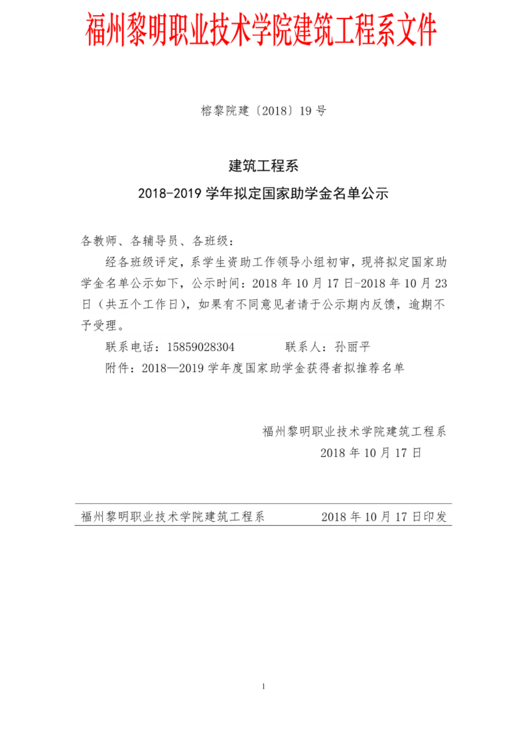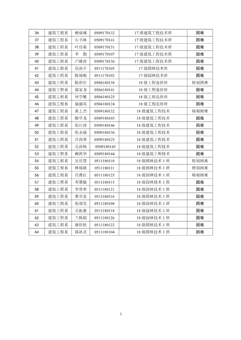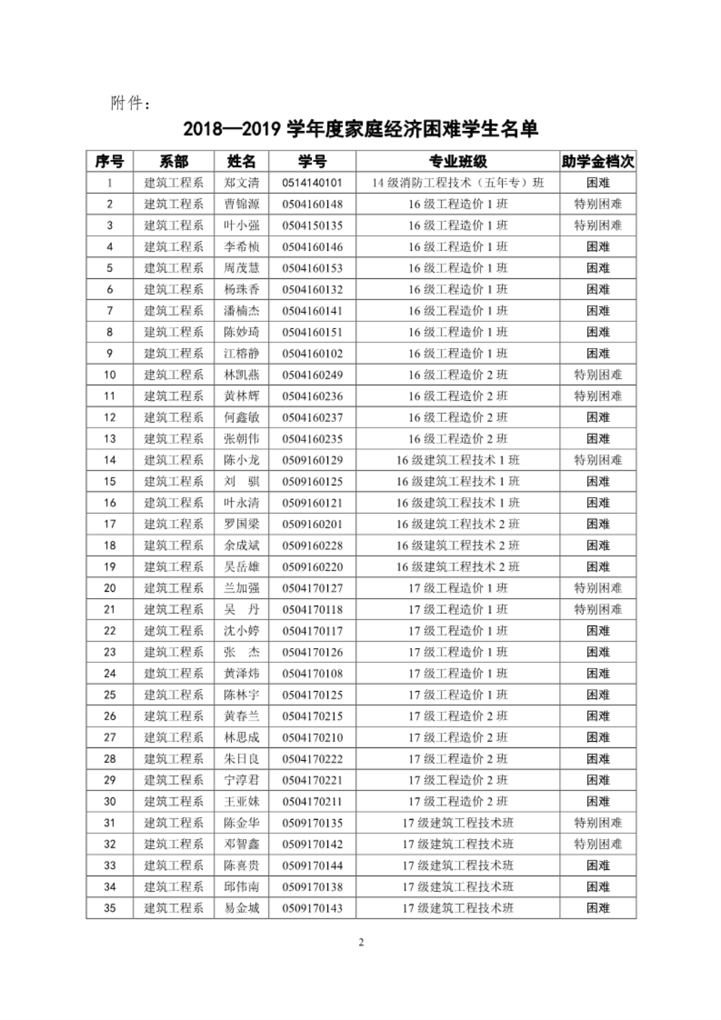 【2018】19号建工系2018-2019学年拟定国家助学金名单公示