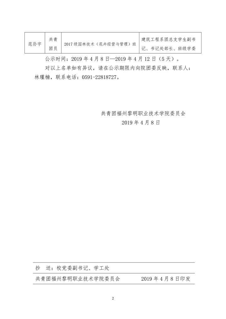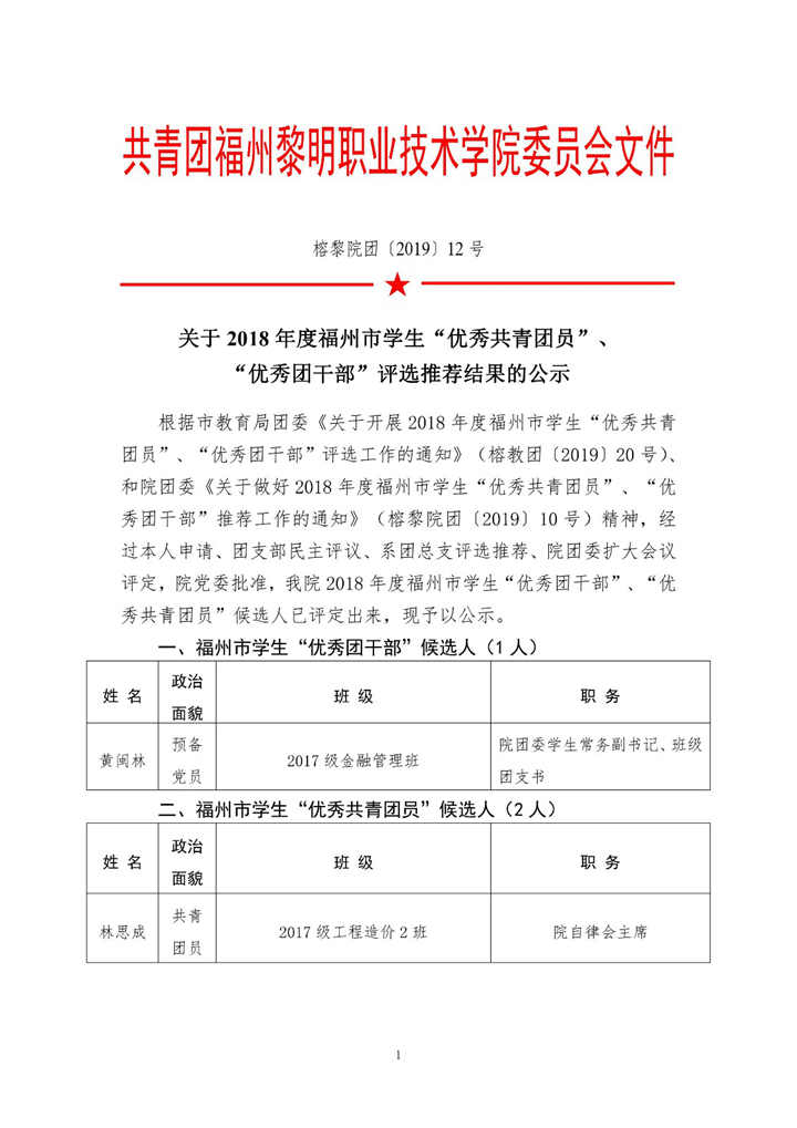 榕黎院团〔2019〕12号 关于2018年度福州市学生“优秀共青团员"“优秀团干部”评选推荐结果的公示
