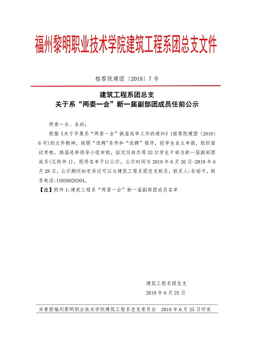 榕黎院建团〔2019〕7号 建筑工程系团总支 关于系“两委一会”新一届副部团成员任前公示