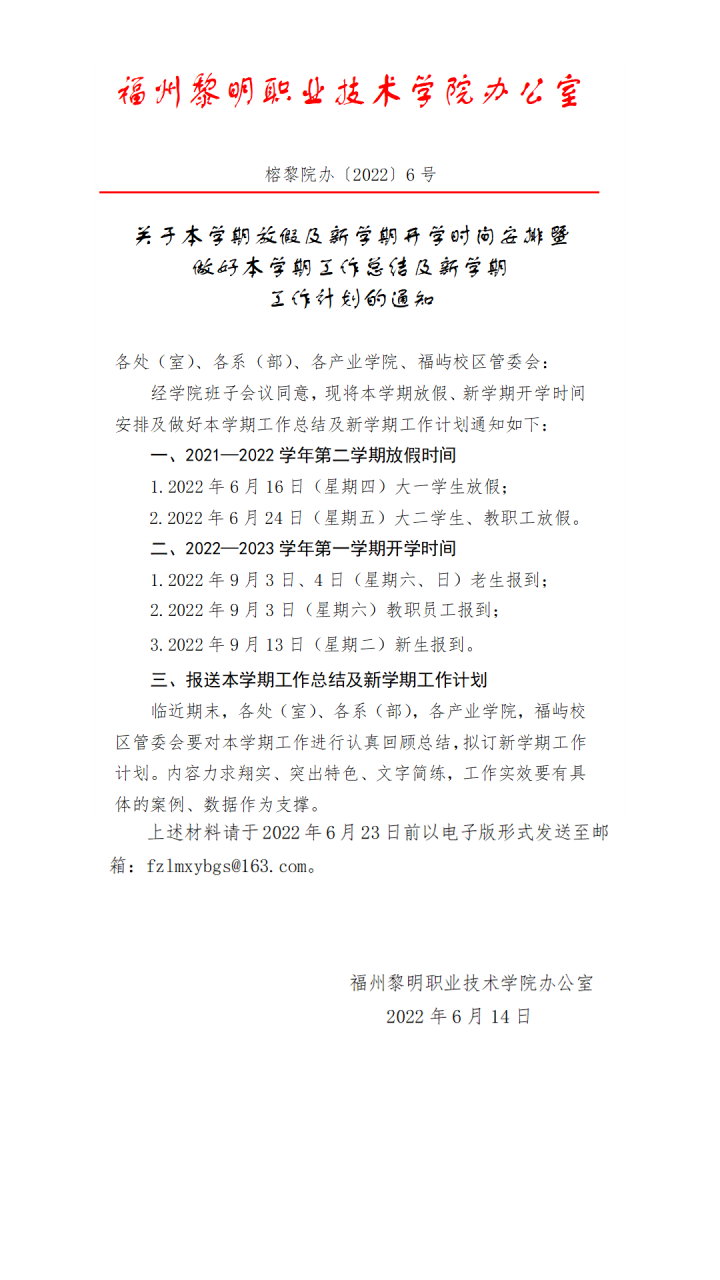 关于本学期放假及新学期开学时间安排暨做好本学期工作总结及新学期工作计划的通知