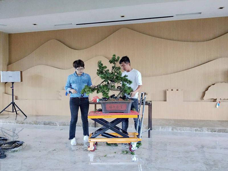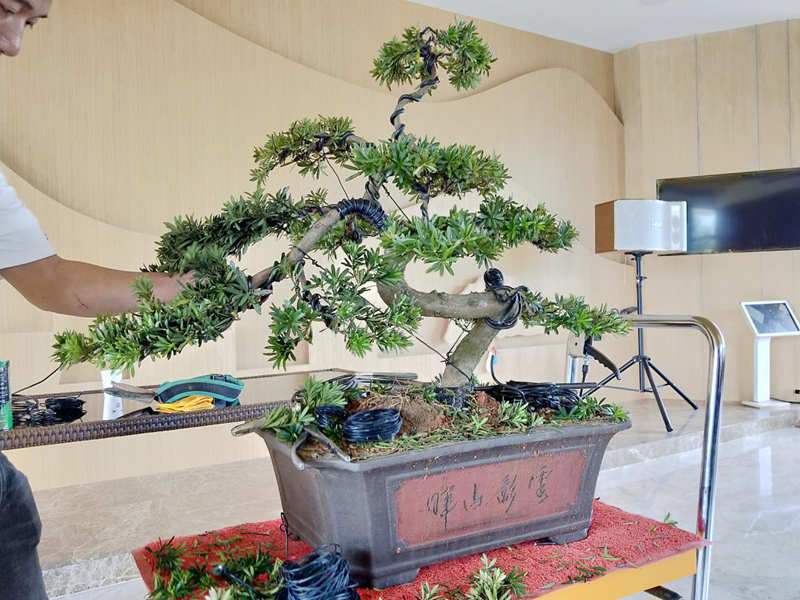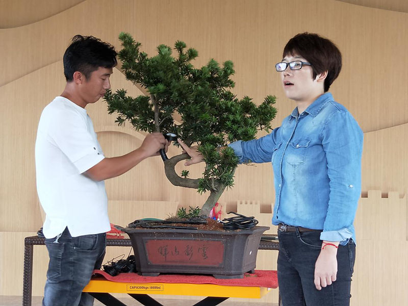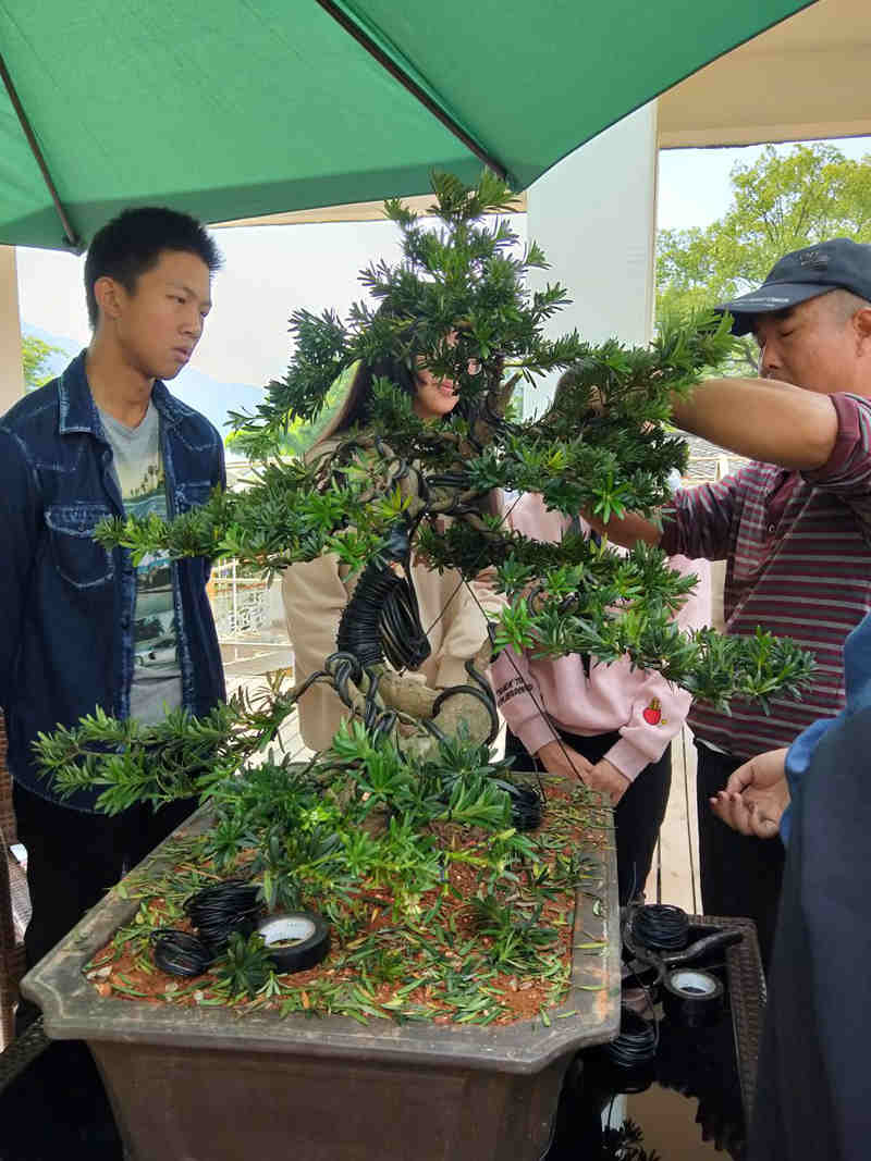 按照我系正常的上课安排,参与课程的有17级、18级园林专业同学。由郑主任全程陪同,园林教研室主任江宝月老师耐心地讲解,讲解内容包括:制作材料介绍,以两盆罗汉松为例,从采用十字方式进行破口,黑胶带进行包扎,根据树枝的粗细选择不同型号的铝线进行缠绕绑扎造型,对枝叶进行修剪,再到1-2年的定型时间等方面的内容。