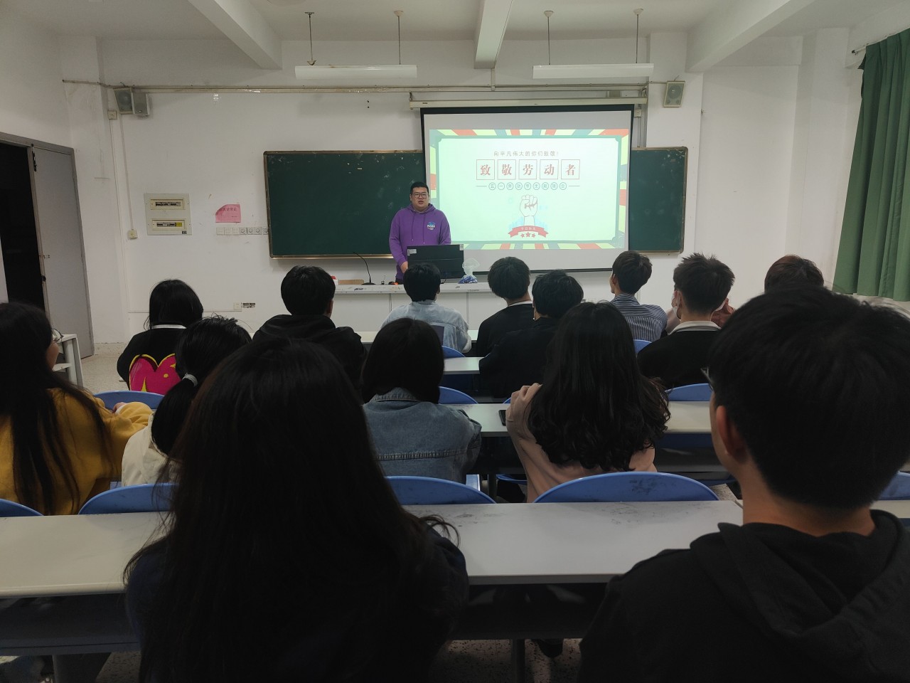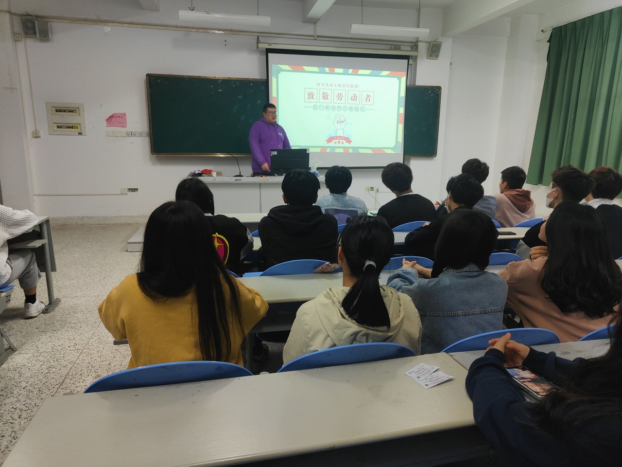 通过主题班会来引导同学们理解开展劳动教育习近平总书记在全国教育大会上提出“培养德智体美劳全面发展的社会主义建设者和接班人”,高校肩负着培育时代新人的职责使命,是青年大学生劳动教育的重要阵地。我系辅导员通过视频、提问、讲解三个环节,结合我校“一手抓爱的教育,一手抓实践教育”的办学理念、大力弘扬大学生劳动精神,培育积极的劳动价值观,积极引导大学生参加社会劳动实践、专业志愿服务、勤工助学活动,在劳动实践中学、做、悟,展现劳动风采、体悟劳动艰辛、感受劳动快乐。