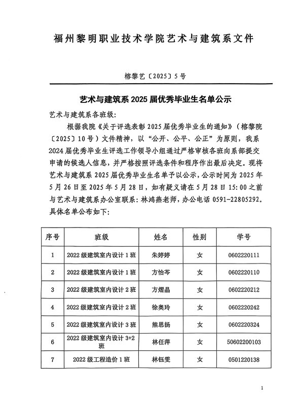 艺术与建筑系2025届优秀毕业生名单公示