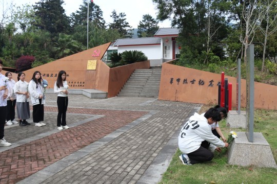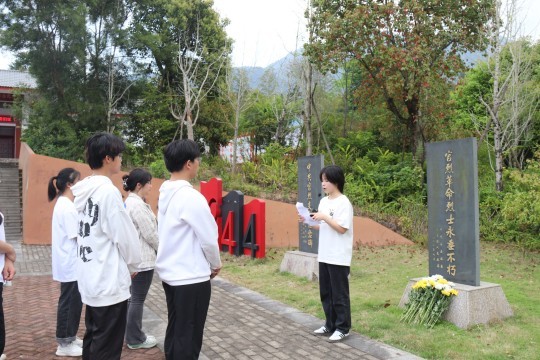 下午两点半,支部书记林鸿燕老师带领师生在官烈村省委旧址革命烈士纪念碑前列队肃立,手持黄白菊花,低头向先烈们默哀,缅怀他们的崇高精神。三分钟的默哀结束后,师生们依次缓缓走向纪念碑,深切缅怀先烈们的英勇奋斗精神。预备党员吴德诗同学作为学生代表发言,她号召大家学习先烈们不屈不挠、坚韧担当、艰苦奋斗的革命精神,珍惜时问,遵纪守法,勤奋学习,积极进取,为民族振兴、国家富强而努力奋斗!