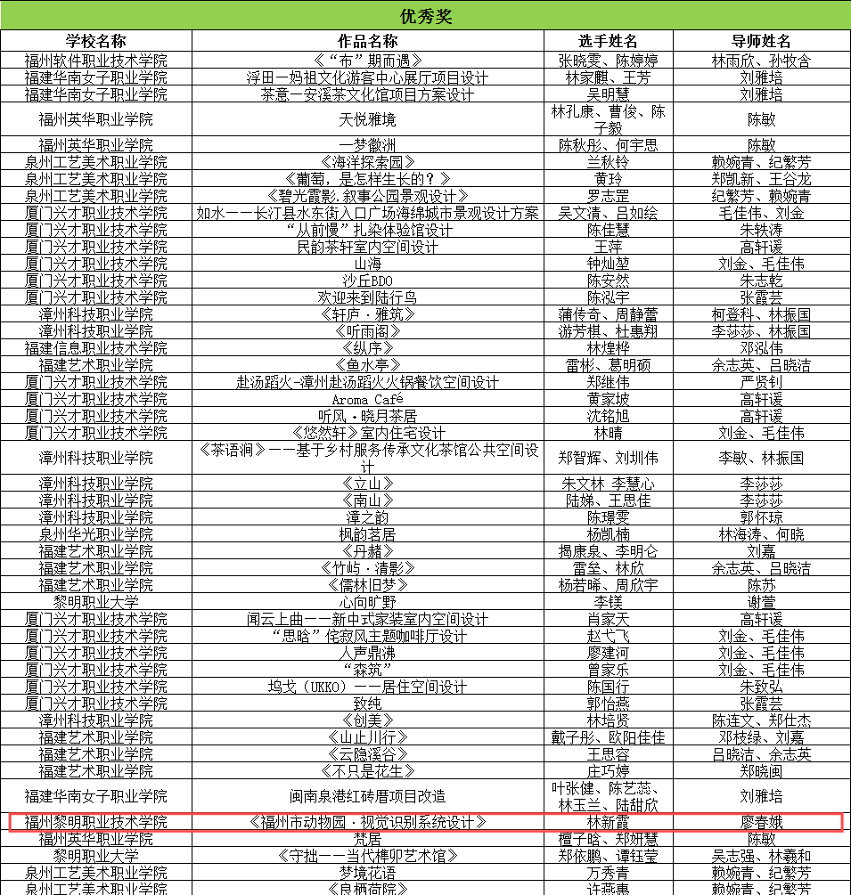 近日,由福建省美术家协会、福建省环境艺术设计协会主办的2024年第四届“美丽中国 茉莉花开”生态可持续创新艺术设计大赛圆满落幕。我系广告艺术设计专业廖春娥老师指导的四项作品参加本次大赛,分别是:22级广告2班林镒、林新霞的作品《西客·闽西客家特产包装设计》获得二等奖;22级广告1班黄丹的作品《宁客·宁化特产包装设计》和黄怡昕、林婉婷的作品《兔儿山·视觉识别系统设计》获得三等奖;22级广告2班林新霞的作品《福州市动物园·视觉识别系统设计》获得优秀奖。