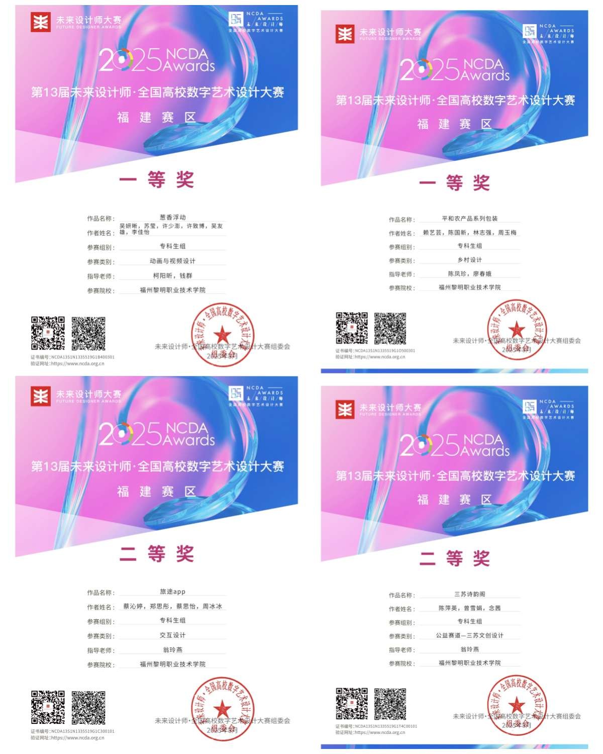 近日,2025年第13届未来设计师·全国高校数字艺术设计大赛省赛(NCDA)圆满落幕。我系师生参赛作品表现出色,喜获15项省级奖项,其中包括一等奖2项、二等奖7项和三等奖6项。同时我系在省赛中荣获“优秀组织奖”称号;吴艺敏老师被评为“优秀组织教师”;我系柯阳昕、钱群、陈凤珍、廖春娥、翁玲燕五名老师获得“优秀指导教师”的荣誉称号。另外在省赛中获得一等奖、二等奖的同学将继续进军全国总决赛,祝贺所有获奖师生们在本次大赛中取得的优异成绩。
