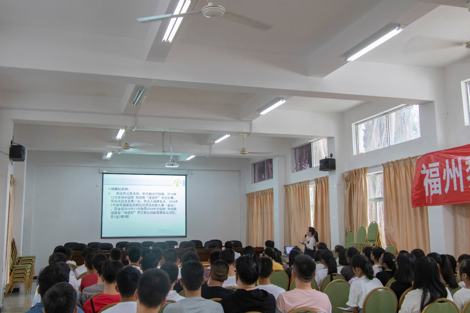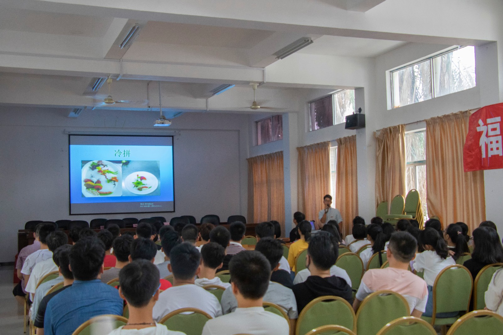 烹饪系全体老师如数出席,我院办公室主任肖熙也受邀出席。由烹饪系党支部书记陈铭帅主持,介绍了出席的各位领导和老师。办公室主任肖熙发表欢迎讲话。管委会主任林功凤对新生提出殷切的希望,最后烹饪系主任冯飞向所有新生致欢迎辞。见面会结束后就是烹饪系的专业介绍会。首先,办公室主任吴丽珍就2018级的专业培养方案向新生介绍了烹调工艺与营养专业的就业前景,人才培养目标,专业教师概况及各学期的重点课程安排。接下来各个专任教师向同学们具体介绍了自己的专业课程,精心制作的PPT,图文并茂,使新生对接下来所要学习的课程产生了浓厚的兴趣。最后,烹饪系主任冯飞和在座的新生们拉起了家常。讲述了烹调工艺与营养专业自建立以来的发展概况,还现身说法,说起自己大学的求学之路,引起了同学们的共鸣。相信,上午的会议让新生对烹饪系有了更深刻的认识,归属感更加强烈。愿所有新生在烹饪系都能如鱼得水,更上一层楼。