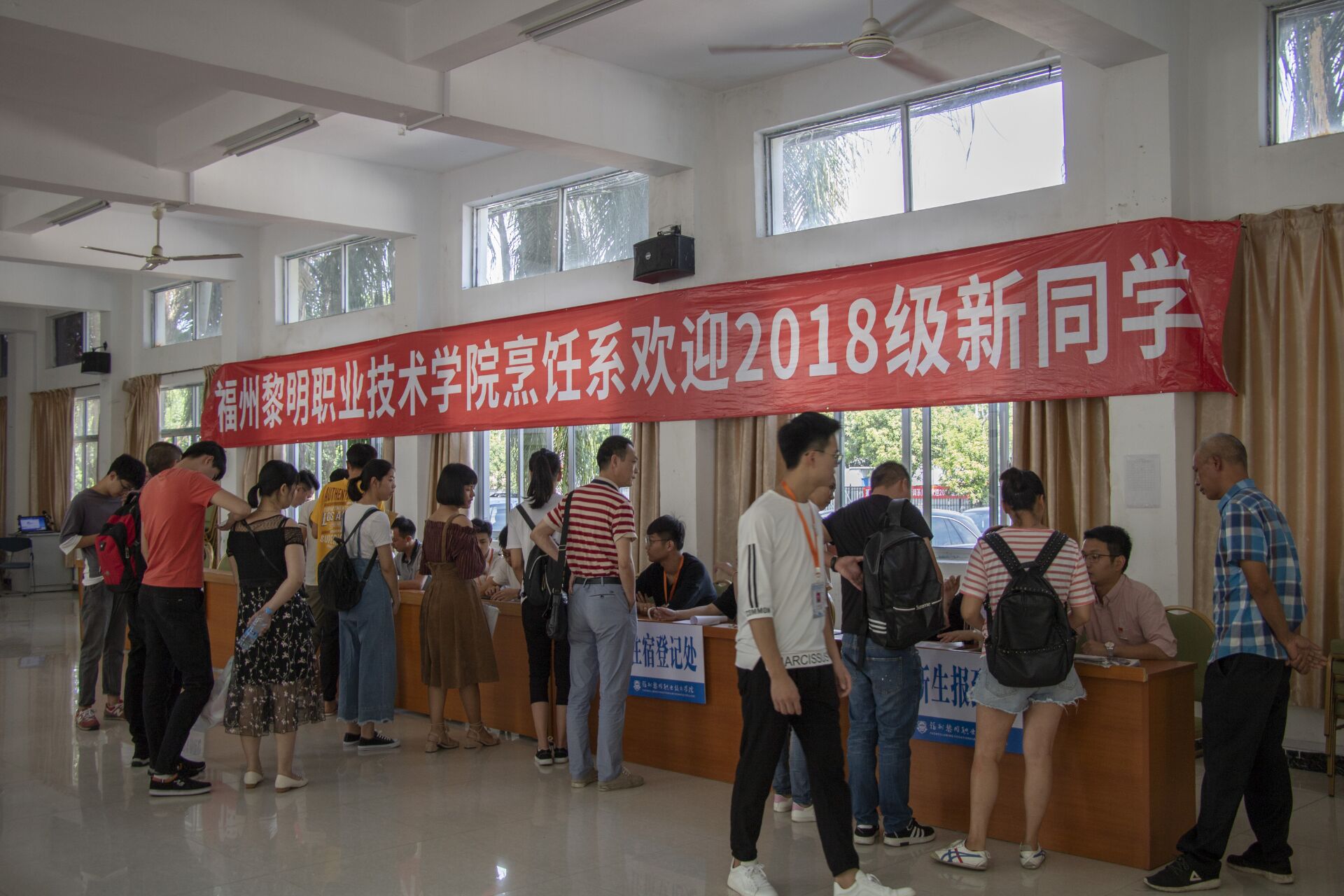 在整个迎新工作中,大家以优质的服务去迎接新生。耐心地与家长沟通,为家长倒水并安排休息座位,迎新人员则领着新生穿梭于报名登记,录指纹,交款缴费等新生办理入学手续必经的各个地方。所有迎新工作人员对每个细节都精益求精,为前来报道的新生营造出了一份家的温馨,让离开家乡的学子们感受到了我院烹饪系这个大家庭的温暖。