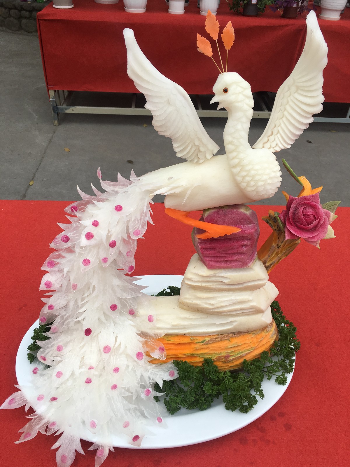 果蔬雕:孔雀开屏,麒麟送瑞,壁雕龙凤,万圣节的微笑,一马当先。