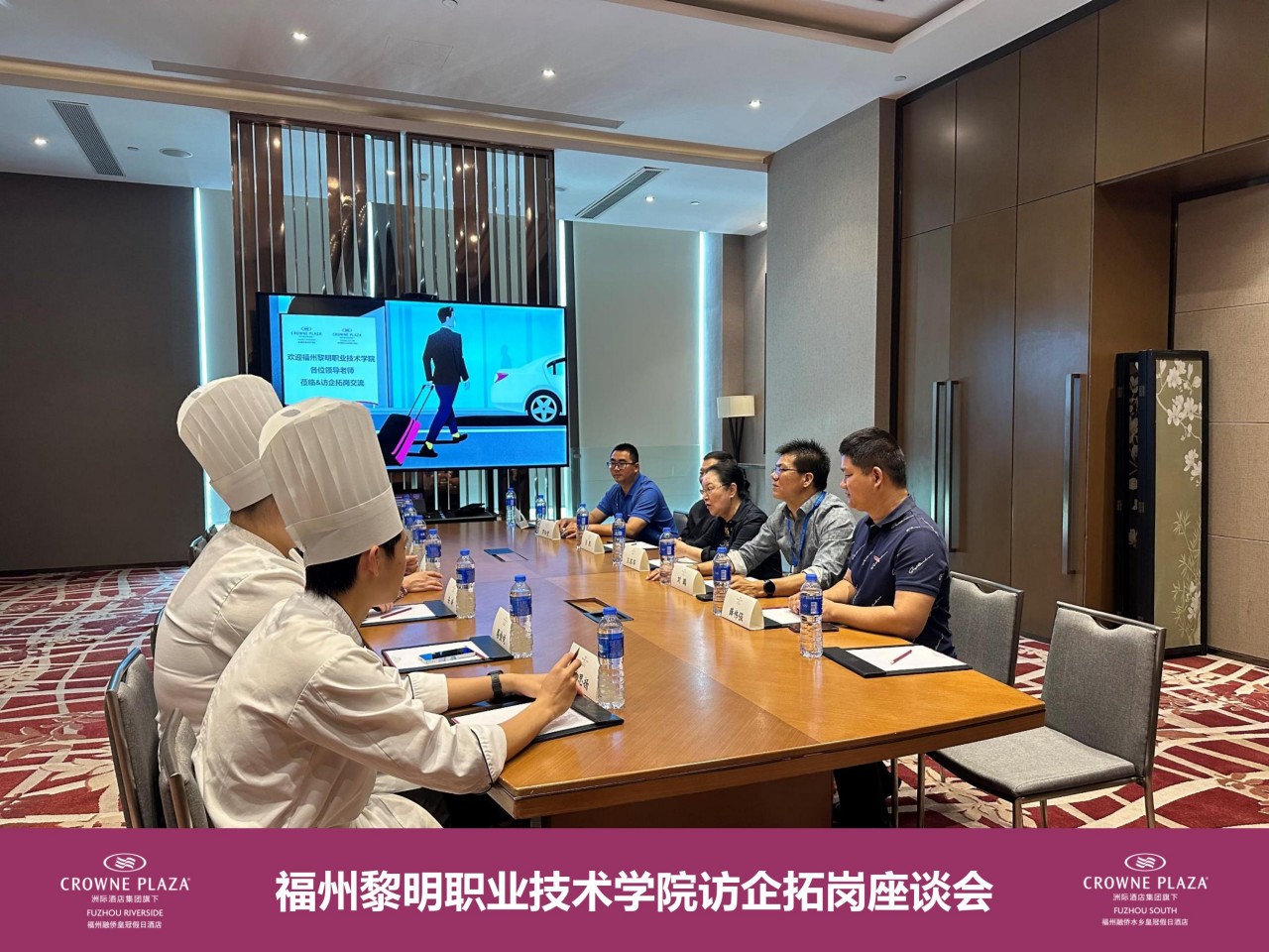 为进一步加强烹饪实习基地建设和学生校外实习管理,提高我院人才培养质量,2024年4月12日,学院王苏华董事长携院领导及烹饪系老师等一行5人赴福州融侨皇冠假日酒店检查烹饪系学生实习工作并慰问实习生,同时与酒店管理层代表、实习学生召开座谈会,深入交流实习生实习的情况。