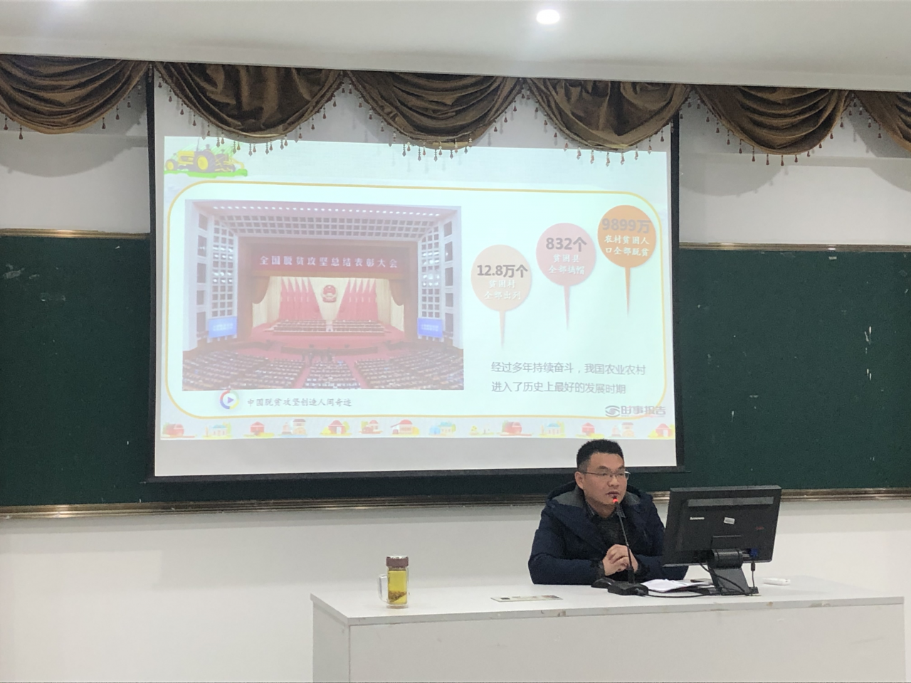 课堂上,杨副院长从“脱贫成果巩固好、粮食安全保障好、富民产业发展好、硬件软件建设好、乡村治理推进好”等五个方面,生动介绍了我国通过全面推进乡村振兴,开启农业农村现代化建设新局面,农业农村展现出的新面貌。他指出,当前我国已经进入新的发展阶段,开启全面建设社会主义现代化国家的新征程中,农业农村现代化出现新的特征,“三农”作用仍然极端重要,面临层次更深、范围更广、难度更大的乡村全面振兴任务。他提出,我们要胸怀两个大局,围绕“国之大者”,抓住重要任务和关键环节,充分利用脱贫攻坚伟大实践创造制度成果和精神财富,在危机中育先机、于变局中开新局。最后,他勉励大家,作为新时代的新青年,要争当乡村振兴的生力军,要弘扬不怕苦、不怕难的精神,用自己所学的专业知识,脚踏实地、勇于奋斗,为祖国的建设,贡献自己的力量。