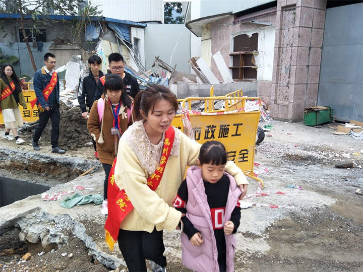 有的志愿者在引导学生靠边行走不奔跑;有的在劝导自行车电动车在路边有序停车,不再往校区方向前进;有的志愿者牵着小朋友的手送他们回家,并时刻叮嘱他们注意脚下的泥泞的碎石……一切井然有序。
