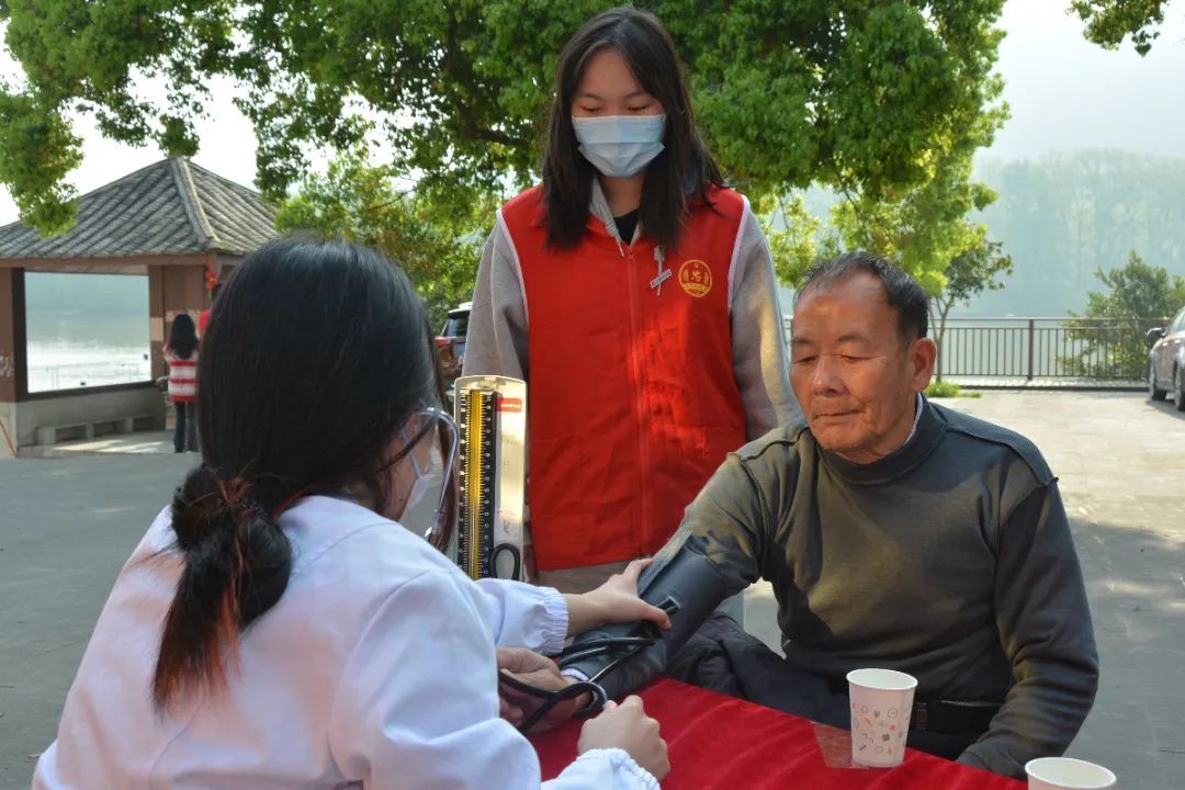 党支部书记郑爱清老师现场指引,党员志愿者们热情接待每一位前来检测的村民,协助老人到检测区域。党员志愿者们分工协作秩序井然,不慌不乱,测量人员协作默契,有序为村民测血糖、量血压、解读宣传小册。并且相关专业党员老师就测量结果给老人提出针对性的治疗建议和指导。