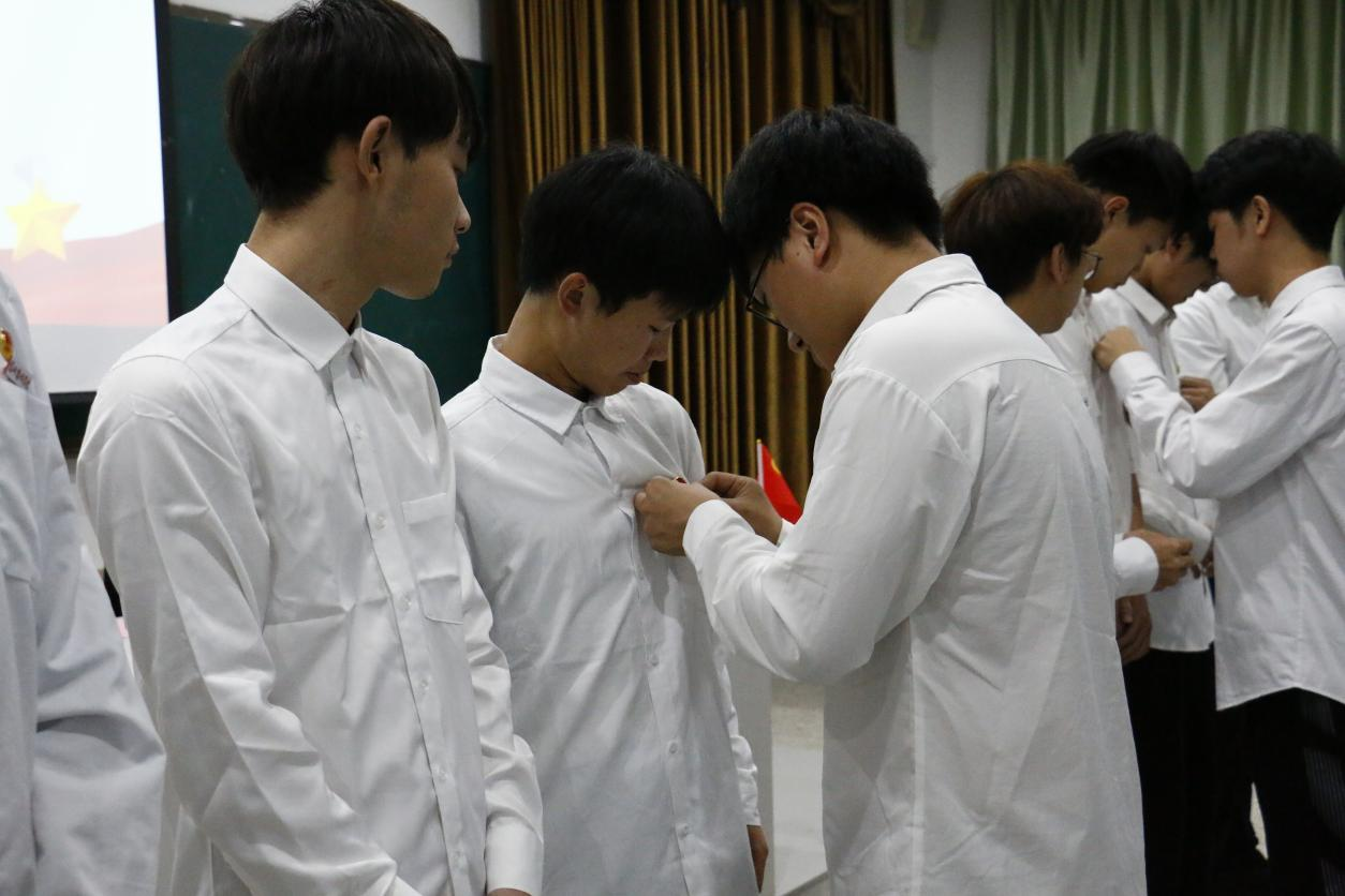 老团员郑重地给新团员颁发团徽,并为他们将其佩戴在左胸前。这代表着他们已经正式承担起作为一名共青团员的使命和责任。