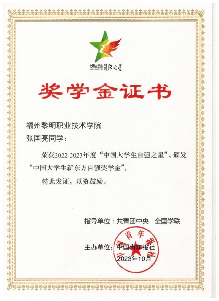 “中国大学生自强之星”奖学金推报活动由共青团中央、全国学联指导,中国青年报社、新东方教育科技集团、中国青年创业就业基金会联合开展,本年度活动以“踔厉奋发 勇毅前行”为主题,全国共遴选出了在爱国修德、勤学求真、创新创业、社区实践、奋斗力行等五个方面表现突出的1850名大学生。福建省仅43所高校的49名大学生获此殊荣。