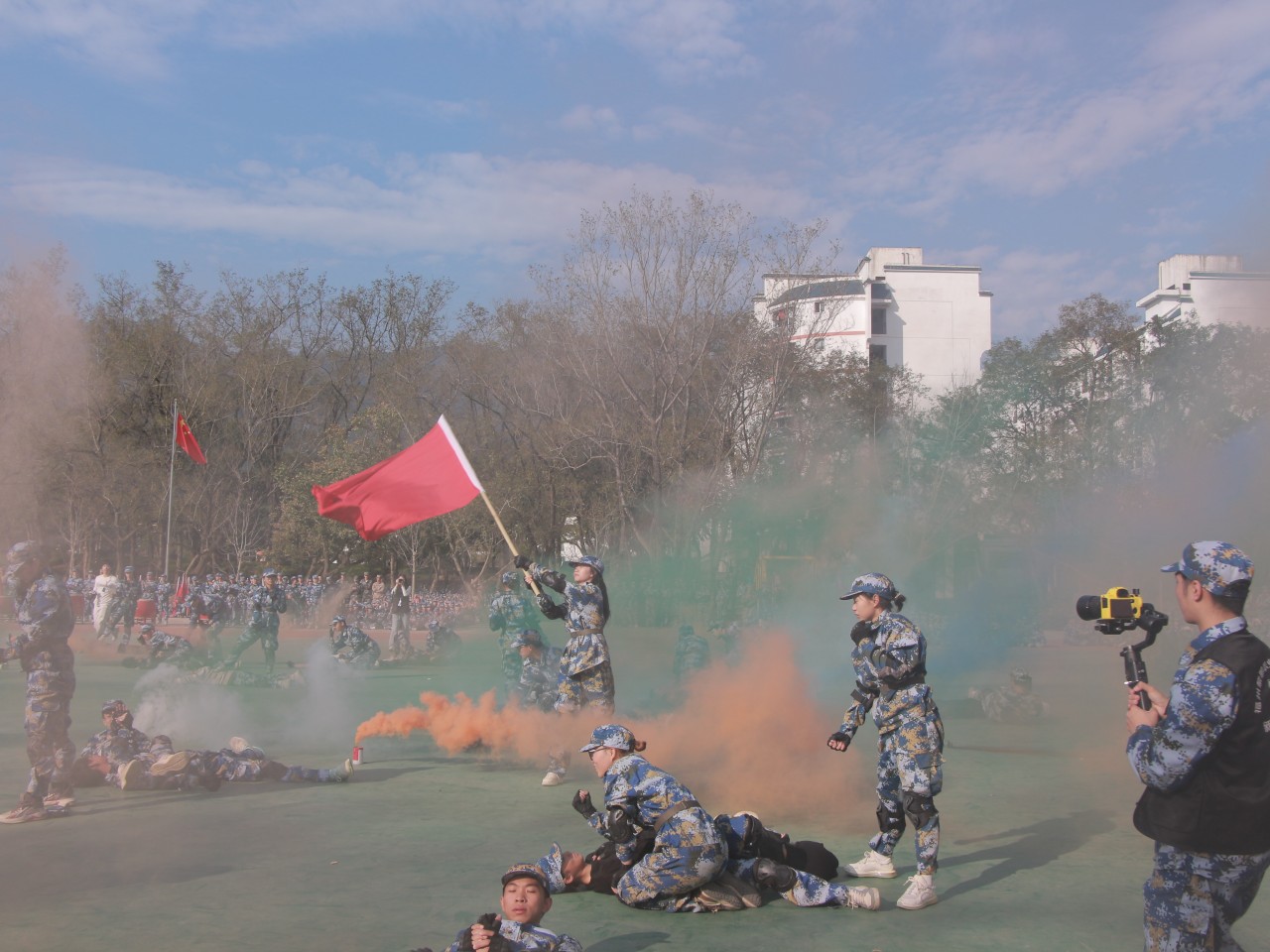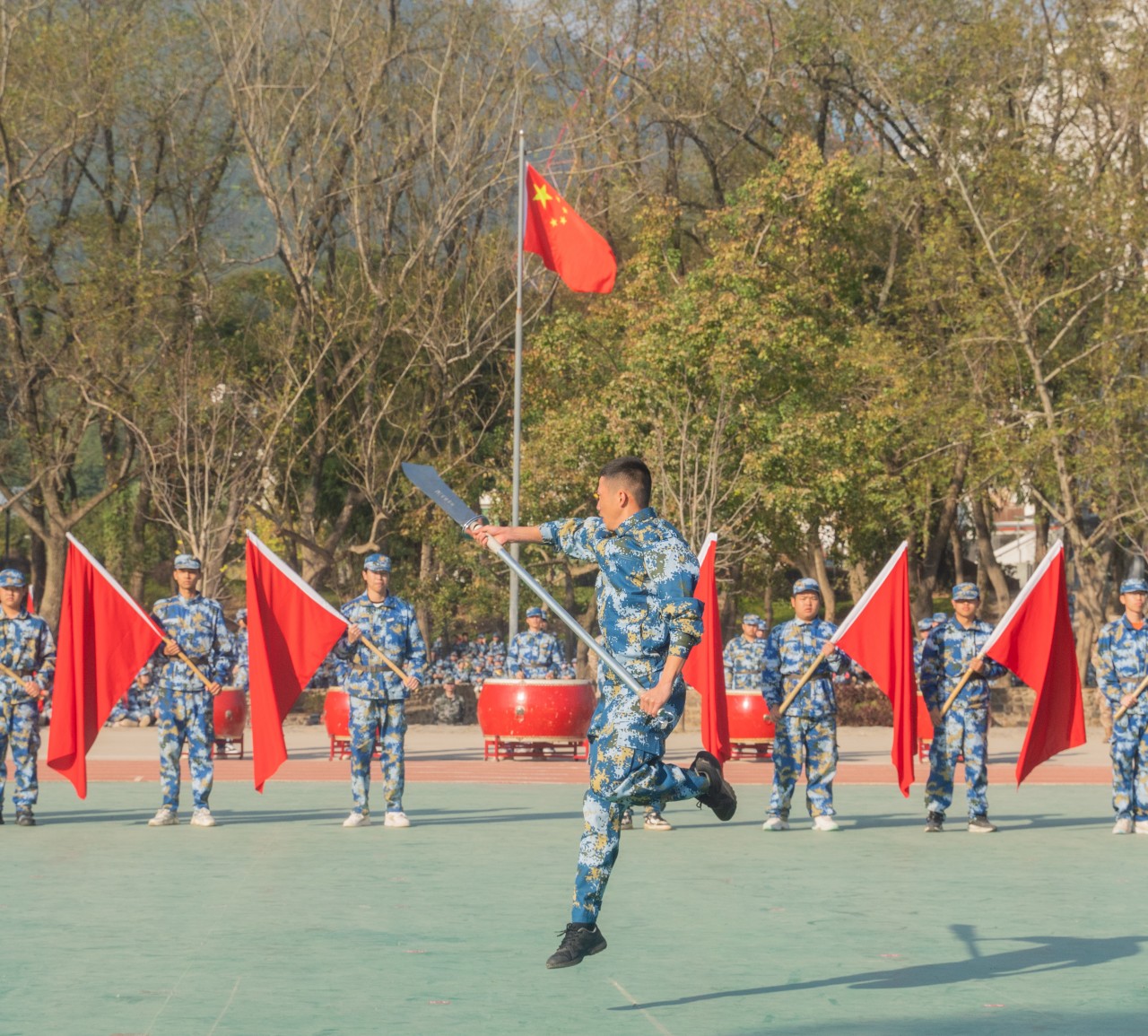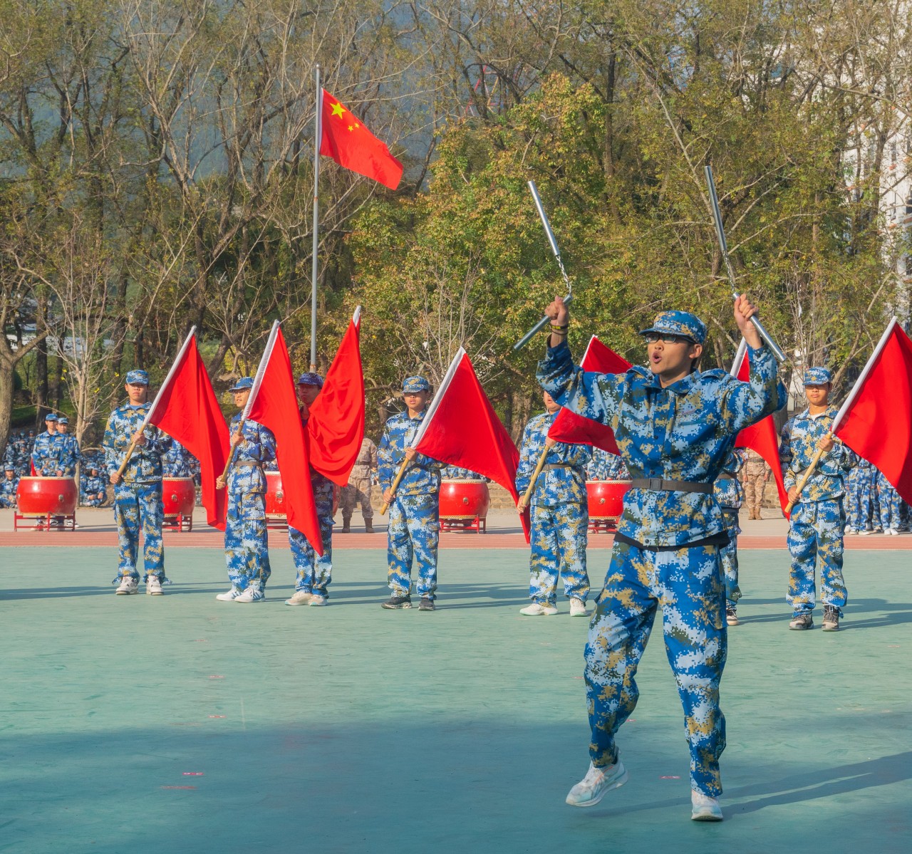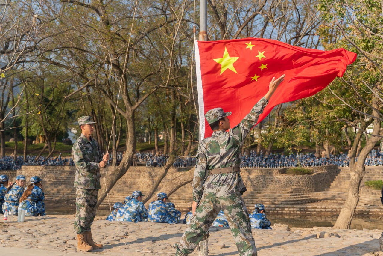 旗手高擎着旗帜。猎猎风起,那旗帜与青春一同飞扬,蓬勃生气在迷彩服里肆意绽放。