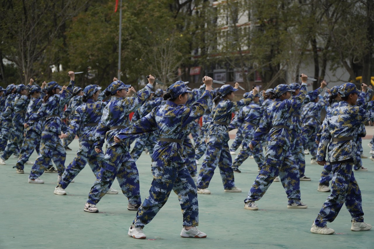 尖锐的匕首蓄势待发,如同出鞘利刃,势如破竹。弓步上刺,闪身反刺,刀起迅猛。黎明学子风采,且看今朝。