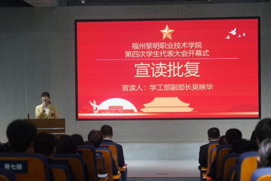 学工部副部长吴映华分别宣读福州市学联和学院党委《关于同意召开福州黎明职业技术学院第四次学生代表大会的批复》。