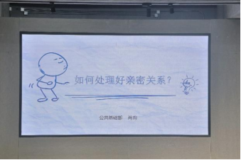 肖昀老师作心理讲座,围绕“如何处理好亲密关系”进行分享,在互动中谈到亲密关系有五个阶段:初次吸引、建立友谊、延续强化、枯萎与衰落以及结束。在日常生活中,要拒绝冷暴力,善于沟通,保持有“爱”的耐心。