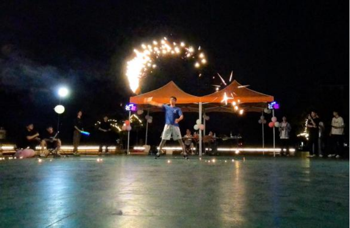 跆拳道协会成员《双截棍》表演,突出了武术技巧和力量,烟火的光芒在夜空中跳跃,展现了院学生社团联合会文化独创性和多元性,为现场增添了一丝青春气息,更是创新性精神的闪耀象征。