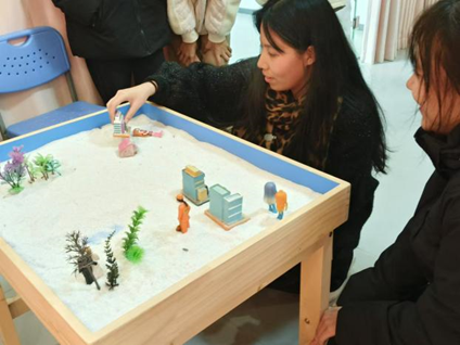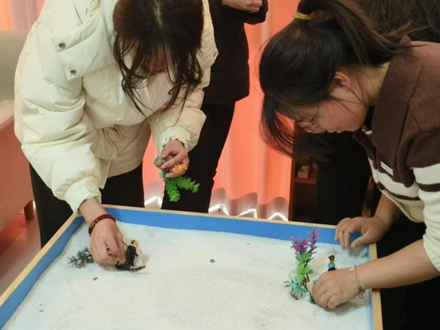 同学们在心理咨询室内参与沙盘游戏,通过摆放物件来表达内心世界。在这里,他们能够放开自我,勇于和他人交流,共同分享创作思路和感受,促进自我认知和心灵成长。