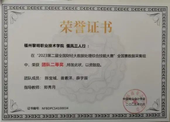 2.第二届全国财经数据大处理综合技能竞赛团队二等奖;