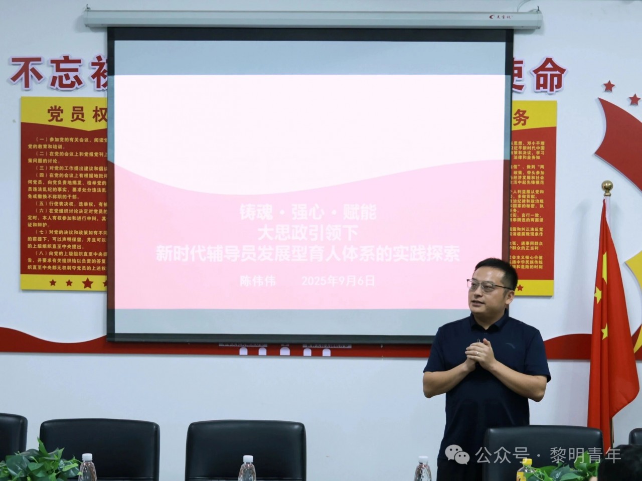 在培训分享环节,学工处处长陈伟伟以“铸魂・强心・赋能--大思政引领下新时代辅导员发展型育人体系的实践探索”为题进行分享。他强调,“大思政”格局是落实立德树人根本任务的核心平台,辅导员应在“三全育人”体系中发挥关键作用。“铸魂”要强化顶层设计,打破德育壁垒;“强心”应构建五育融合的心理育人路径;“赋能”则需依托“火苗守护”等计划,全面提升辅导员的综合能力。