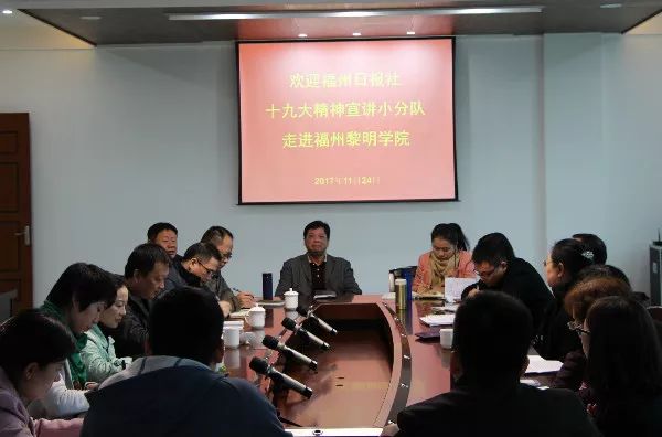 2017年11月24日下午,福州黎明职业技术学院优秀学生代表及教师代表与福州日报社十九大精神宣讲小分队在综合楼六层会议室进行座谈。