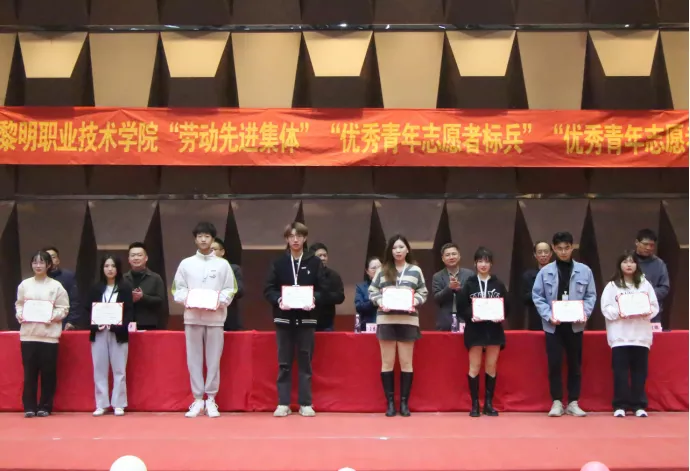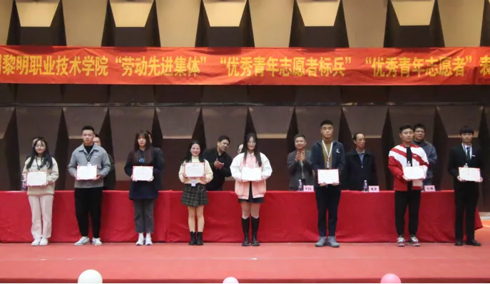 学工处处长、团委书记陈伟伟老师宣读《关于表彰2020-2021学年度福州黎明职业技术学院“劳动先进集体”、“优秀青年志愿者标兵”和“优秀青年志愿者”的决定》, 授予6个班级“劳动先进集体”荣誉称号,49名同学“优秀青年志愿者标兵”荣誉称号,89名同学“优秀青年志愿者”荣誉称号。