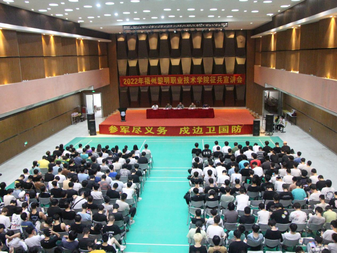 为深入学习贯彻习近平强军思想,推进新时代强军事业,高效高质完成2022年征兵任务,鼓励大学生积极应征入伍,提高兵源征集质量,推进国防和军队现代化建设。2022年6月18日下午15:00福州黎明职业技术学院在学术报告厅开展2022年征兵宣讲会。出席本次宣讲会领导嘉宾有:福州市鼓楼区人武部副部长潘传华,学院党委副书记王新华,福州市洪山镇武装部部长董建忠,学院征兵工作站站长、学工处处长陈伟伟,商务系党支部书记毛永千,以及征兵工作站相关工作人员和全体辅导员们。本次宣讲会由学工处刘锦源主持。